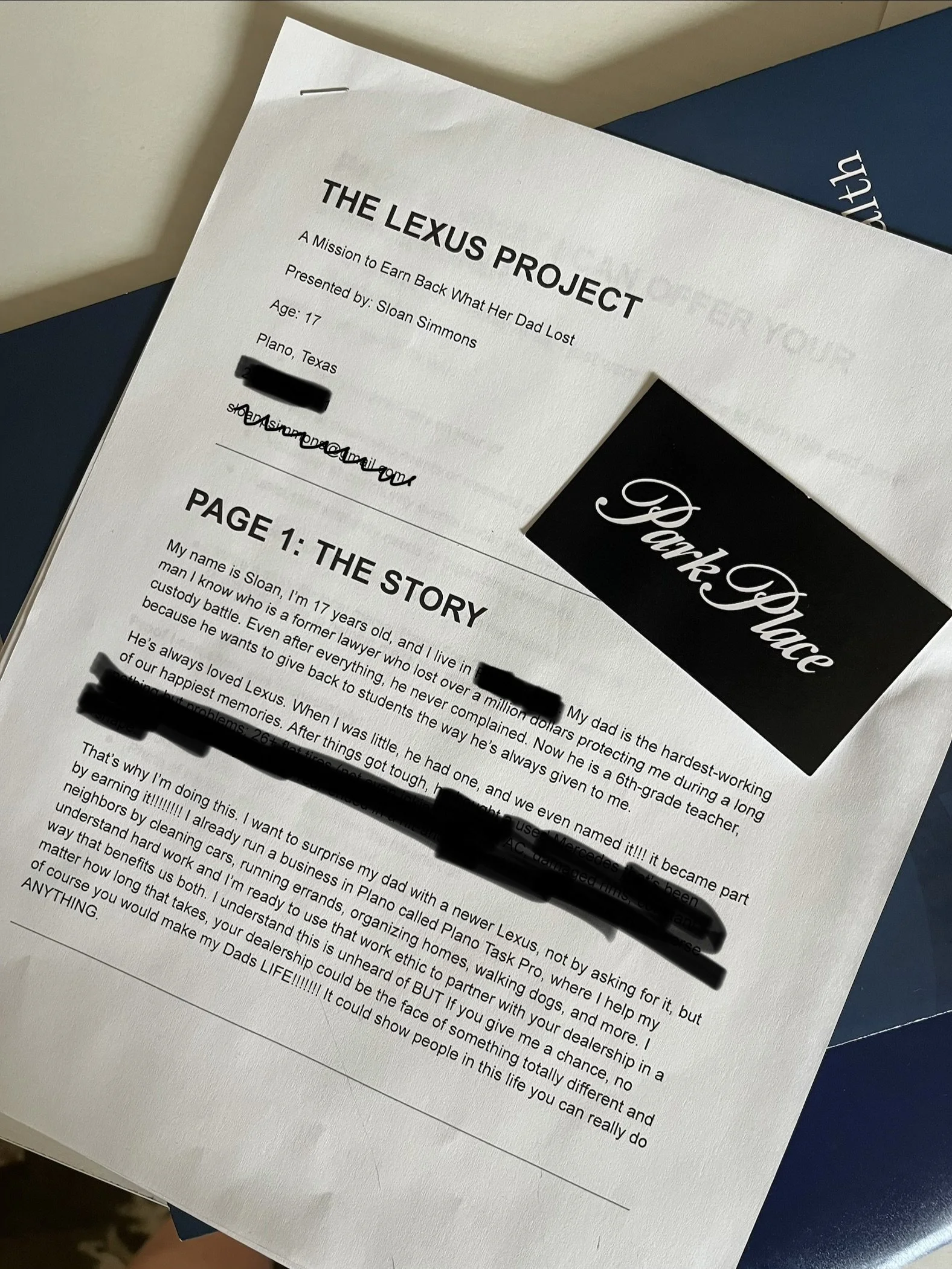 this was the front page of the packet I made when I tried to earn my dad a lexus. the packet consisted of his story, our story, HOW i could help the dealership and ultimately EARN the lexus for my dad! this sounds crazy outlandish, i know, but i still went up there, talked to the manager, GOT A BUSINESS CARD, and a CALL BACK! now, i endedup being too young at the time to “work” or even volunteer there, but i still went up there and got farther than most people would.